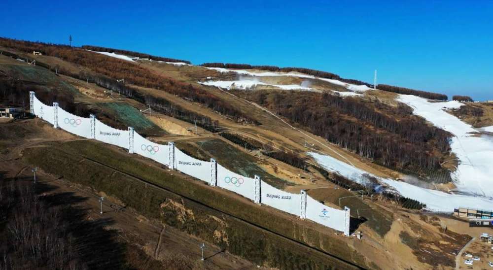 (图为建设中的北京冬奥会云顶滑雪公园防风网全貌)