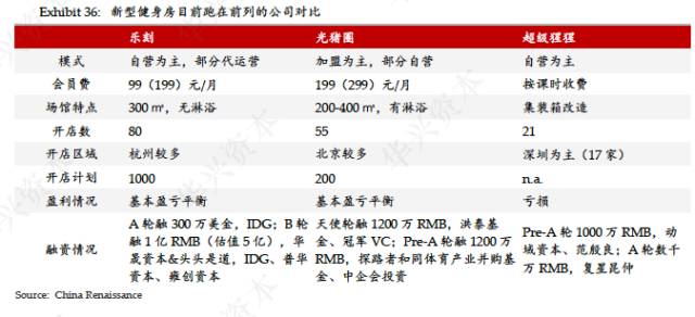 华兴资本的健身报告也表示,新型健身房因为有和传统大型连锁健身房明确差异的定位,二者之间并不存在刺刀见红的竞争。类似理念的新型连锁之间则有可能存在竞争,目前跑在前列的公司包括乐刻、光猪圈、超级猩猩等。