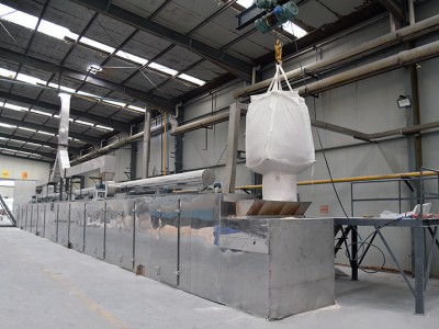 网带干燥机流程:通过热风对金属网带上物料进行干燥。冷风经过换热器换热后,送入网带式干燥箱内;热风通过循环风机吸入风道,从设备网带底部经过分风板均匀分配后,穿透网带干燥物料循环干燥,尾气由专门排湿风机排出,每一排出废气均有调节阀控制.热气由下往上穿过铺满物料的网带,完成热量与质量传递的过程,带走物料水分.网带缓慢移动,运行速度可根据物料干燥情况自由调节。